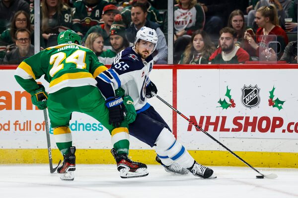 Mark Scheifele of the Winnipeg Jets skates with the puck while Matt Dumba of the Minnesota Wild defends in the third period at Xcel Energy Center on Nov. 23, 2022 in St Paul, Minn. The Wild defeated the Jets 6-1.David Berding/Getty Images