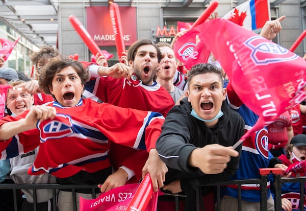 Montreal Canadiens fans cheer on their team outside the Bell Centre in Montreal on July 2, 2021, prior to Game 3 of the NHL Stanley Cup final against the Tampa Bay Lightning.Graham Hughes/The Canadian Press