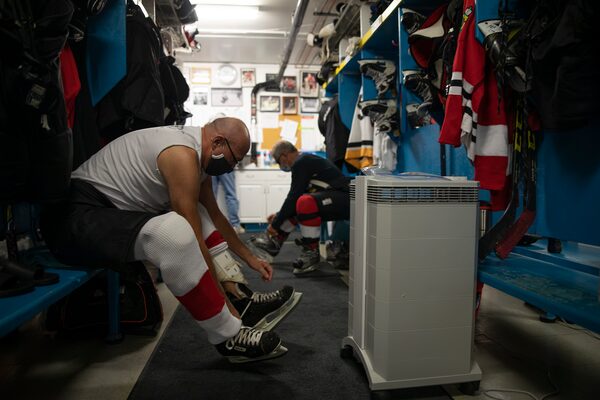 Dale Babuik, left, ties his skates beside a HEPA filter. Enhanced cleaning, smaller teams and mask-wearing are a few of the new measures being taken to get players back on the ice.Kayle Neis/The Globe and Mail