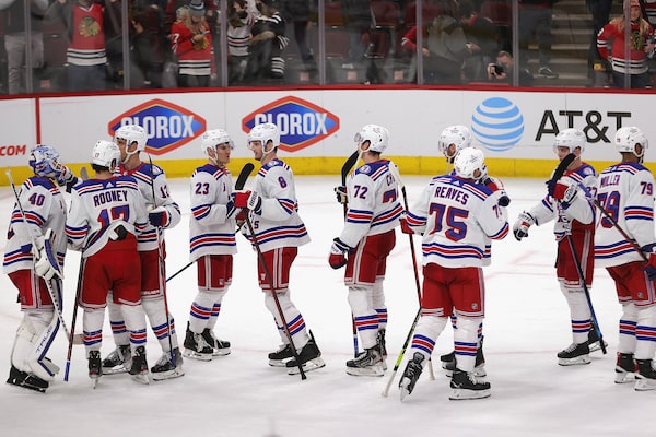 New York Rangers players celebrate a win over the Chicago Blackhawks, at the United Center, in Chicago, Ill., on Dec. 07.Jonathan Daniel/Getty Images