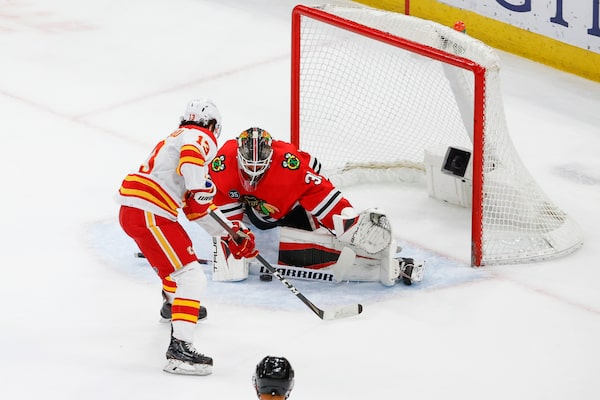 Chicago Blackhawks goaltender Kevin Lankinen defends against Calgary Flames left wing Johnny Gaudreau during the first period. The Flames won 5-2 on April 18, 2022, in Chicago.Kamil Krzaczynski/The Associated Press
