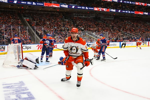 Anaheim Ducks' Cutter Gauthier celebrates a goal against Edmonton Oilers during the third period.CODIE MCLACHLAN/The Canadian Press