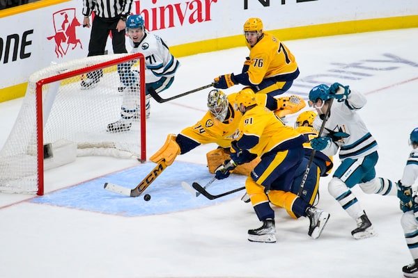 Nashville Predators goaltender Juuse Saros (74) blocks the shot of San Jose Sharks left wing Igor Chernyshov (92) during a game last month at Bridgestone Arena.Steve Roberts/Reuters