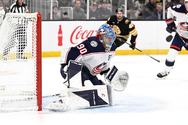 Columbus Blue Jackets goaltender Elvis Merzlikins (90) protects the net without his stick during a February game against the Boston Bruins at TD Garden.Eric Canha/Reuters