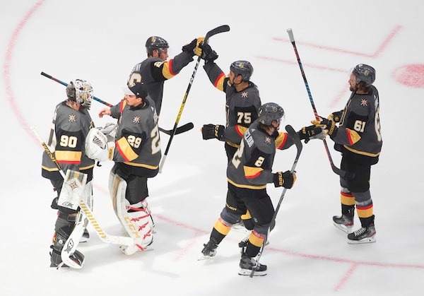 Vegas Golden Knights celebrate the win following third period NHL Western Conference final playoff action against the Dallas Stars, in Edmonton on Tuesday, Sept. 8, 2020. THE CANADIAN PRESS/Jason FransonThe Canadian Press