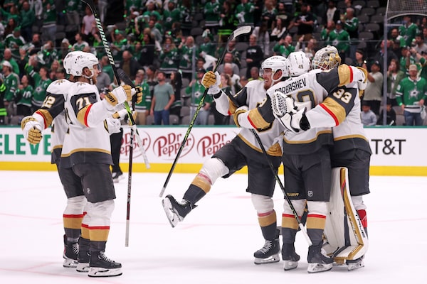 The Vegas Golden Knights celebrate after defeating the Dallas Stars 6 - 0 in Game 6 of the Western Conference Final of the 2023 Stanley Cup Playoffs at American Airlines Center on May 29, 2023 in Dallas.Steph Chambers/Getty Images