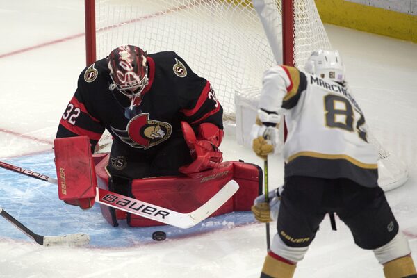 Ottawa Senators goalie Filip Gustavsson makes a save on a shot from Vegas Golden Knights center Jonathan Marchessault in the third period at the Canadian Tire Centre. The Golden Knights beat the Senators 5-1 on Nov. 4, 2021.Marc DesRosiers/USA TODAY Sports via Reuters
