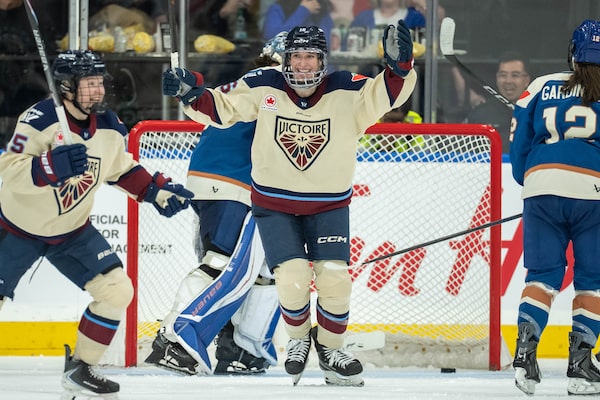 Hayley Scamurra of the Montreal Victoire celebrates her goal against the Vancouver Goldeneyes during the third period of their game in Vancouver on Tuesday.ETHAN CAIRNS/The Canadian Press