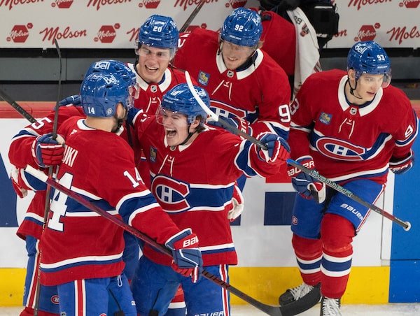 Montreal Canadiens' Cole Caufield, centre, celebrates with teammates after their 4-2 win against the Carolina Hurricanes on April 16, 2025.Christinne Muschi/The Canadian Press