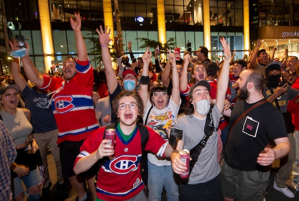 Montreal Canadiens fans celebrate on Rue Rene Levesque after the Canadiens defeated the Vegas Golden Knights to advance to the Stanley Cup final.Peter Mccabe/The Canadian Press