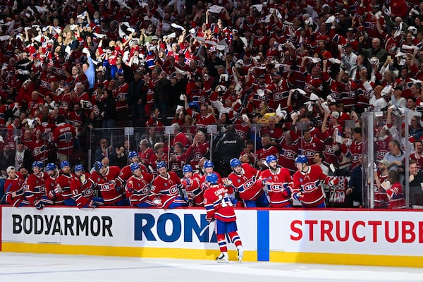 Cole Caufield (13) of the Montréal Canadiens celebrates his goal with teammates on the bench during the second period against the Tampa Bay Lightning in Game 4 of their first-round playoff series at the Bell Centre on Sunday.Minas Panagiotakis/Getty Images