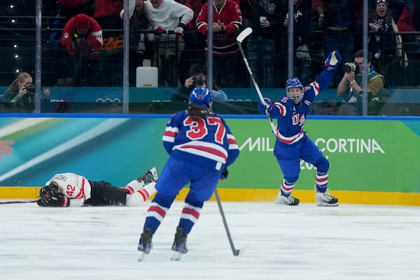 U.S. forward Jack Hughes celebrates after scoring the winning goal against Canada in overtime at the men's hockey gold medal game at the Milian Cortina Winter Olympics last month.Carolyn Kaster/The Associated Press