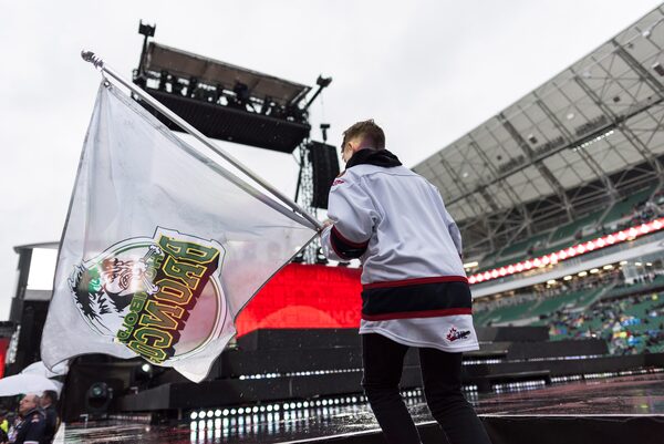 Will Mitchell carries a Humboldt Broncos flag to the stage during a tribute to the hockey team at the Memorial Cup opening ceremony Thursday in Regina.Michael Bell/The Canadian Press