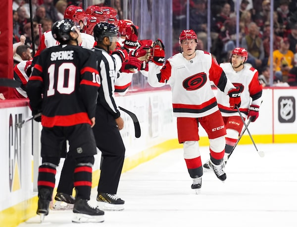 The second Carolina penalty came when Hall was whistled for an illegal check to the head on Ottawa’ No. 1 defenceman Jake Sanderson, whose helmet flew off, and left fans calling for a major.