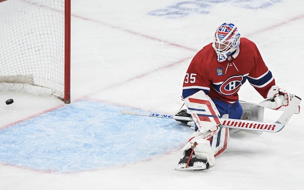 Montreal Canadiens goaltender Sam Montembeault looks back after being scored on by Carolina Hurricanes' Jordan Staal during second period NHL hockey action in Montreal, March 30, 2024.Graham Hughes/The Canadian Press