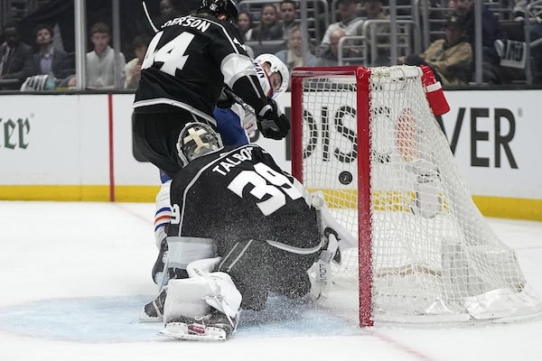 Los Angeles Kings goaltender Cam Talbot, centre, is scored on by Edmonton Oilers left wing Zach Hyman, right, as defenceman Mikey Anderson defends during Game 3 of an NHL hockey Stanley Cup first-round playoff series. The Oilers won 6-1 on April 26, 2024, in Los Angeles.Mark J. Terrill/The Associated Press