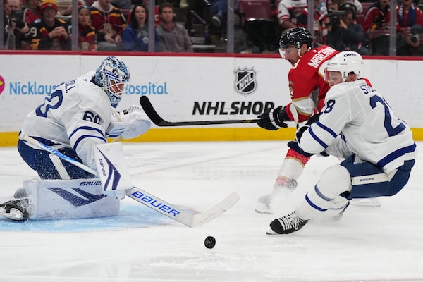 Toronto Maple Leafs goaltender Joseph Woll (60) defends a shot by Florida Panthers left wing Brad Marchand (63) during their game last month in Sunrise, Fla.Lynne Sladky/The Associated Press