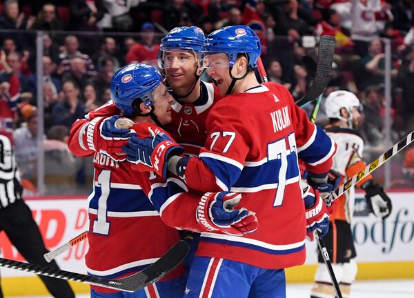 Montreal Canadiens forward Brendan Gallagher (11) reacts with left wing Ilya Kovalchuk (17) and defenseman Brett Kulak (77) after scoring a goal against the Anaheim Ducks during the second period at the Bell Centre in Montreal on Feb. 6, 2020.Eric Bolte/USA TODAY Sports via Reuters