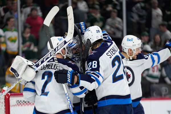 Winnipeg Jets goaltender Connor Hellebuyck, middle, celebrates with teammates after the 3-1 win against the Minnesota Wild of an NHL hockey game, on April 11 in St. Paul, Minn.Abbie Parr/The Associated Press