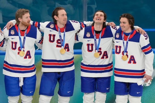 (From left) Kyle Connor (81), Zach Werenski (8), Jack Hughes (86) and Clayton Keller (91) react after receiving their gold medals on Sunday after the United States defeated Canada in the men's hockey gold medal game at the Milan Cortina Winter Olympics.Luca Bruno/The Associated Press