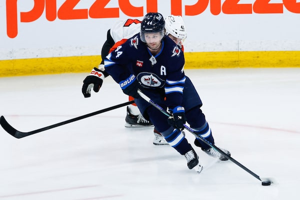 Winnipeg Jets defenceman Josh Morrissey (44) skates away from Philadelphia Flyers forward Luke Glendening (41) during third period play at Canada Life Centre on Saturday.Terrence Lee/Reuters