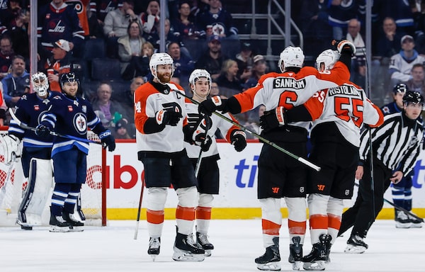 Philadelphia Flyers players celebrate Travis Sanheim's (6) goal against the Winnipeg Jets during their game in Winnipeg on Saturday.JOHN WOODS/The Canadian Press