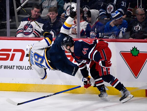 Winnipeg Jets' Josh Morrissey checks St. Louis Blues' Ivan Barbashev during the third period in Winnipeg. The Jets won 4-2 on Jan. 30, 2023.FRED GREENSLADE/The Canadian Press
