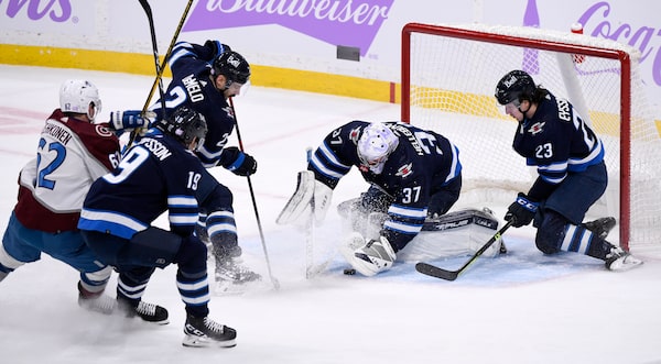 Winnipeg Jets goaltender Connor Hellebuyck covers up a loose puck as Dylan Demelo, Mikey Eyssimont and David Gustafsson defend against Colorado Avalanche's Artturi Lehkonen during the first period in Winnipeg. The Jets won 5-0 on Nov. 29, 2022.FRED GREENSLADE/The Canadian Press