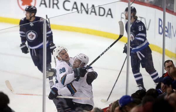 San Jose Sharks' Timo Meier (28) and Joe Pavelski (8) celebrate after Pavelski scored with just seconds left to beat the Winnipeg Jets during third period NHL hockey action in Winnipeg on March 12, 2019.Trevor Hagan/The Canadian Press