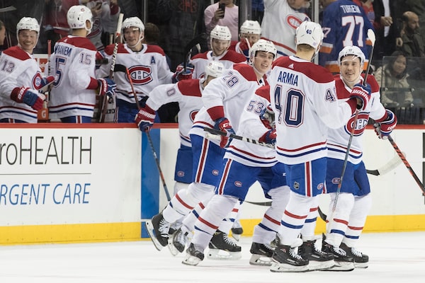 Montreal Canadiens right wing Joel Armia (40) celebrates after scoring the winning goal during the shootout of an NHL hockey game against the New York Islanders, on Nov. 5, 2018, in New York.Mary Altaffer/The Associated Press