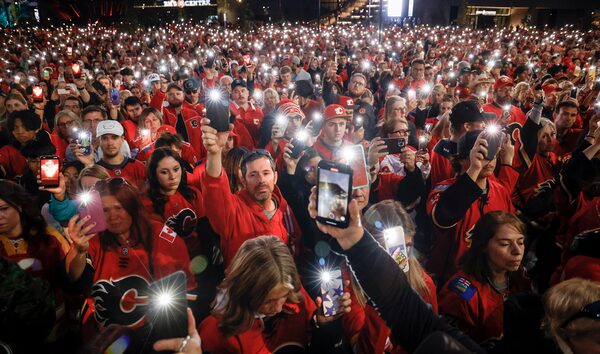 The mood was mostly sombre in Calgary outside the Saddledome as the crowd grew from hundreds to thousands leading up to the program paying respect to the two brothers.