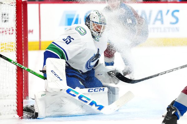Vancouver Canucks goaltender Thatcher Demko defends his net in the second period against the Colorado Avalanche at Ball Arena. The Avalanche won 5-2 on Nov. 22, 2023.Ron Chenoy/Reuters