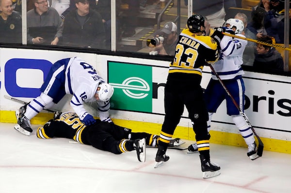 Boston Bruins defenceman Zdeno Chara shoves Toronto Maple Leafs centre Nazem Kadri to retaliate for Kadri late hit on Boston Bruins centre Tommy Wingels, bottom left.Elise Amendola/The Canadian Press