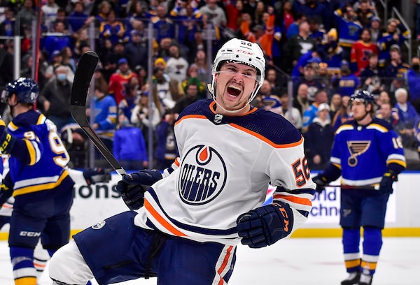 Edmonton Oilers right wing Kailer Yamamoto (56) reacts after scoring the game winning goal against the St. Louis Blues during the third period at Enterprise Center in St. Louis on Nov. 14, 2021.Jeff Curry/USA TODAY Sports via Reuters