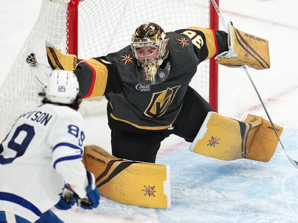 Vegas Golden Knights goaltender Logan Thompson makes a glove save against the Toronto Maple Leafs during the third period at T-Mobile Arena. The Golden Knights won 3-1 on Oct. 24, 2022.Stephen R. Sylvanie/USA TODAY Sports via Reuters