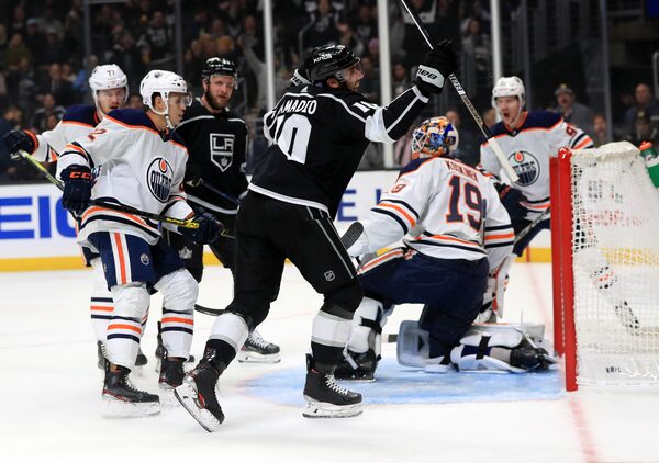 LOS ANGELES, CALIFORNIA - NOVEMBER 21: Michael Amadio #10 of the Los Angeles Kings reacts to scoring a goal as Mikko Koskinen #19 of the Edmonton Oilers looks on during the second period at Staples Center on November 21, 2019 in Los Angeles, California.Sean M. Haffey/Getty Images