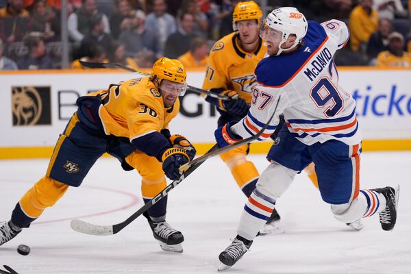 Just 44 seconds after Nashville tied the game at 2-all late in the second period, McDavid picked up a puck in the low slot and lifted a wrist shot over Saros.