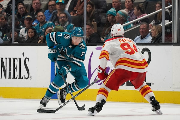 San Jose Sharks centre Nico Sturm advances the puck against Calgary Flames defenceman Brayden Pachal during the second period at SAP Center at San Jose. The Flames won 3-2 in overtime on April 9, 2024.David Gonzales/Reuters