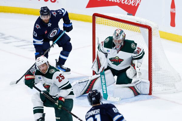 Jake Middleton scored Minnesota’s first goal, a wrister from the point through some traffic that went over Connor Hellebuyck’s blocker at 4:06 of the first period.
