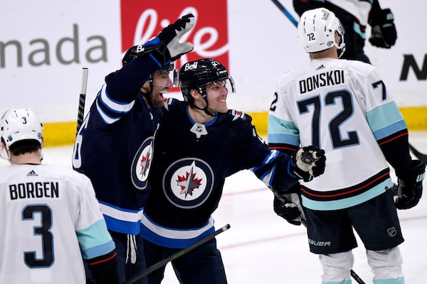 Winnipeg Jets' Blake Wheeler (26) celebrates his goal against the Seattle Kraken with Nikolaj Ehlers (27) during the third period of NHL action in Winnipeg on Sunday May 1, 2022.FRED GREENSLADE/The Canadian Press