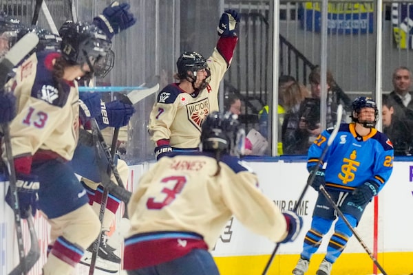 Montreal Victoire's Laura Stacey celebrates after scoring the winning goal during overtime PWHL hockey action against the Toronto Sceptres, in Toronto, Saturday, Dec. 21.Chris Young/The Canadian Press