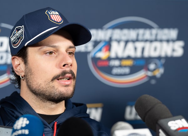 United States captain Austin Matthews speaks with the media following practice at the 4 Nations Face-Off in Brossard, Que. last year.Christinne Muschi/The Canadian Press