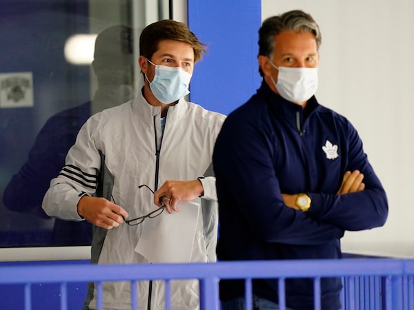 Maple Leafs general manager Kyle Dubas, left, and president Brendan Shanahan attend a workout in Toronto in July.John E. Sokolowski/USA TODAY Sports via Reuters