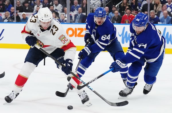 Florida Panthers' Carter Verhaeghe, left, battles for the puck with Toronto Maple Leafs' Morgan Rielly, right, as David Kampf, centre, looks on during first period NHL playoff hockey action in Toronto on May 14.Nathan Denette/The Canadian Press
