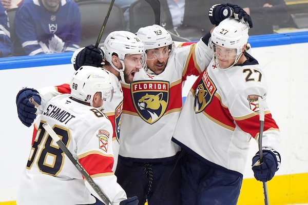 Florida Panthers defenceman Nate Schmidt, left, defenceman Uvis Balinskis, forward Brad Marchand, and forward Eetu Luostarinen celebrate a third-period goal against the Toronto Maple Leafs during Game 1 of round two of the NHL playoffs in Toronto on Monday, May 5, 2025.Frank Gunn/The Canadian Press