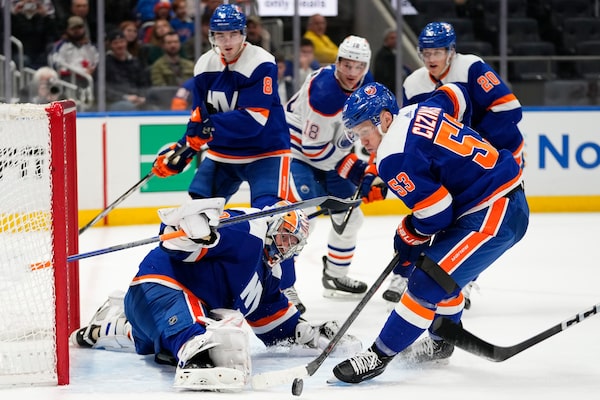 New York Islanders' Casey Cizikas and goaltender Ilya Sorokin protect their net during the first period against the Edmonton Oilers. The Islanders won 3-1 on Dec. 19, 2023, in Elmont, N.Y.Frank Franklin II/The Associated Press