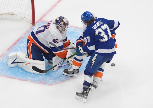 Tampa Bay Lightning left wing Yanni Gourde is stopped by New York Islanders goaltender Semyon Varlamov in overtime on Sept. 15, 2020. The Lightning and Islanders meet in Game 6 on Thursday night.JASON FRANSON/The Canadian Press