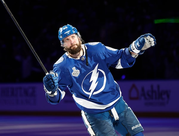 Tampa Bay Lightning right wing Nikita Kucherov celebrates after defeating the Montreal Canadiens 5-1 in Game 1 of the 2021 Stanley Cup Final at Amalie Arena.Kim Klement/USA TODAY Sports via Reuters