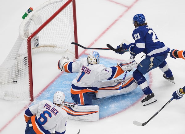 Tampa Bay Lighting' Brayden Point (21) scores on New York Islanders goalie Thomas Greiss (1) during first period NHL Eastern Conference final playoff action in Edmonton on Monday, Sept. 7, 2020.JASON FRANSON/The Canadian Press