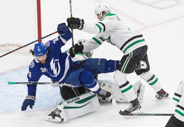 Dallas Stars defenceman Miro Heiskanen checks Tampa Bay Lightning's Brayden Point on top of Stars goalie Anton Khudobin during third period of Game 2 of the Stanley Cup finals. The Lightning won 3-2 on Sept. 21, 2020.JASON FRANSON/The Canadian Press